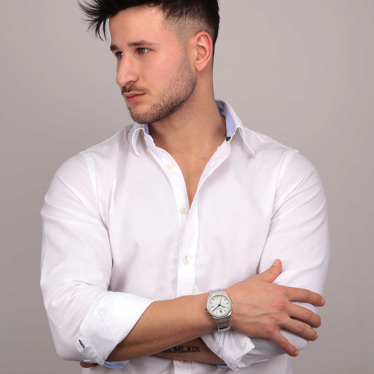 This Maserati watch for men, model R8853142005, features a sleek silver dial and a matching silver metal belt. Its elegant design makes it a versatile accessory for everyday wear or special occasions. Durable and stylish, it combines classic looks with reliable performance.