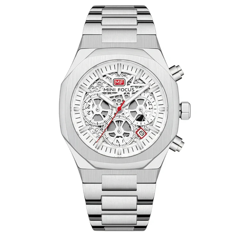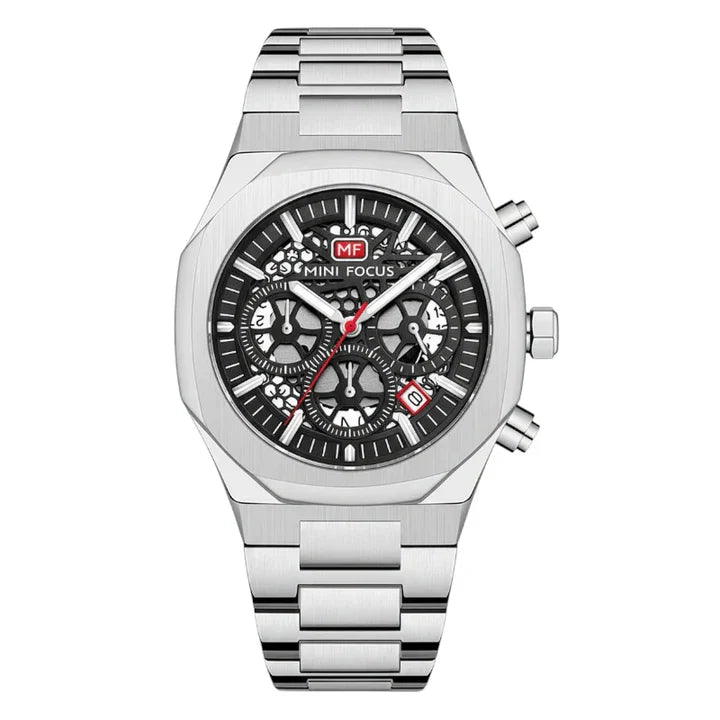 الميزة الأبرز هي وظيفة الكرونوغراف الكاملة، مع ثلاثة عدادات فرعية دقيقة لقياس الوقت بدقة، وإضافة لمسة عملية تم تزويد الساعة بنافذة لعرض التاريخ. بفضل حركة الكوارتز الدقيقة،