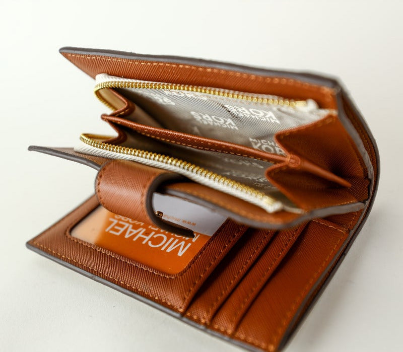 This elegant MK Crafted with meticulous attention to detail, it showcases the brand's signature style and impeccable quality. The wallet's exterior boasts the iconic Mk logo pattern in a sophisticated combination of beige and brown. This timeless design is both stylish and versatile, making it suitable for everyday use or special occasions.
