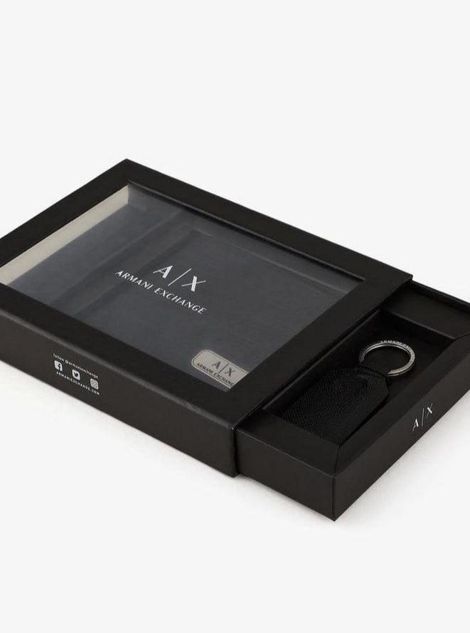Elevate his everyday carry with the effortlessly stylish Armani Exchange Men's Black Textured Wallet & Keychain Gift Set. This perfectly matched duo combines essential functionality with the distinct urban aesthetic of A|X.
