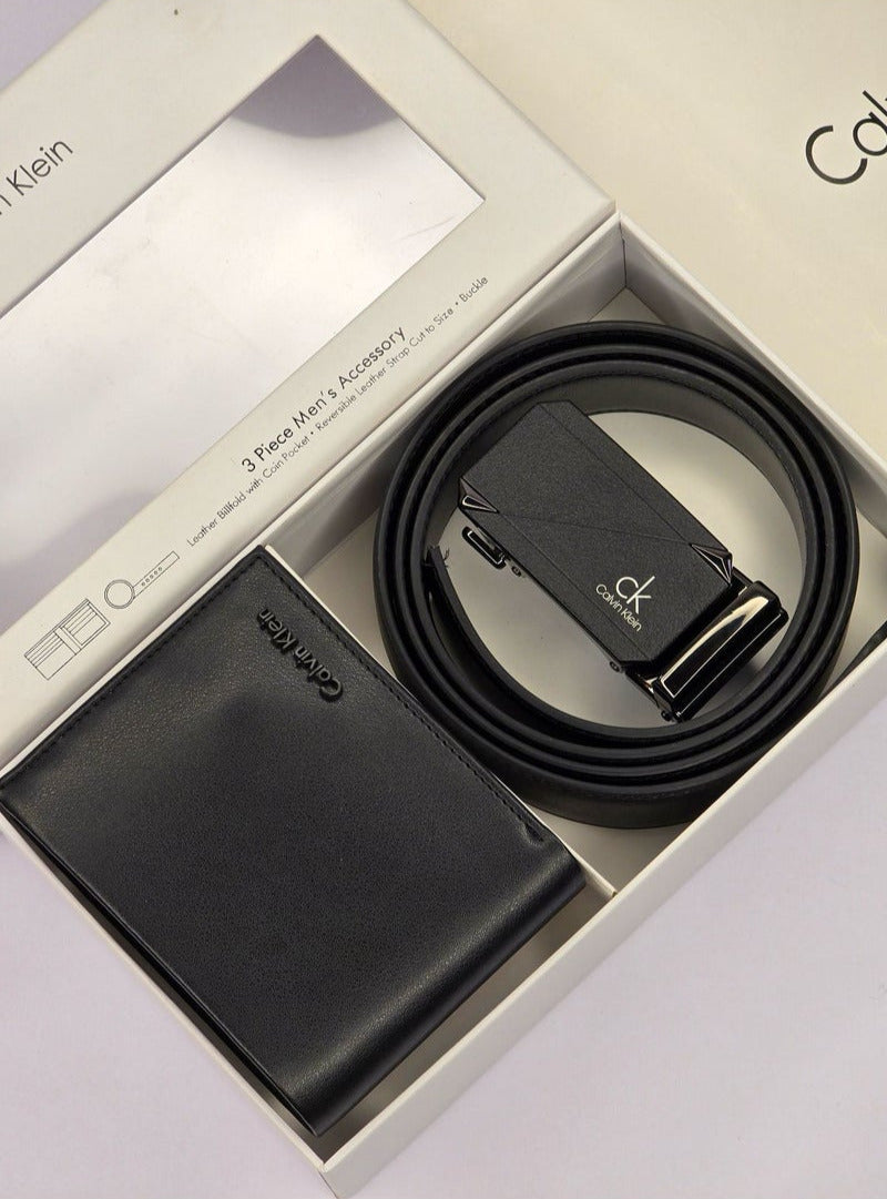 This versatile Calvin Klein set combines essential accessories for any man's wardrobe. The classic black leather belt and wallet are perfect for both casual and formal occasions, ensuring a polished look no matter the situation.