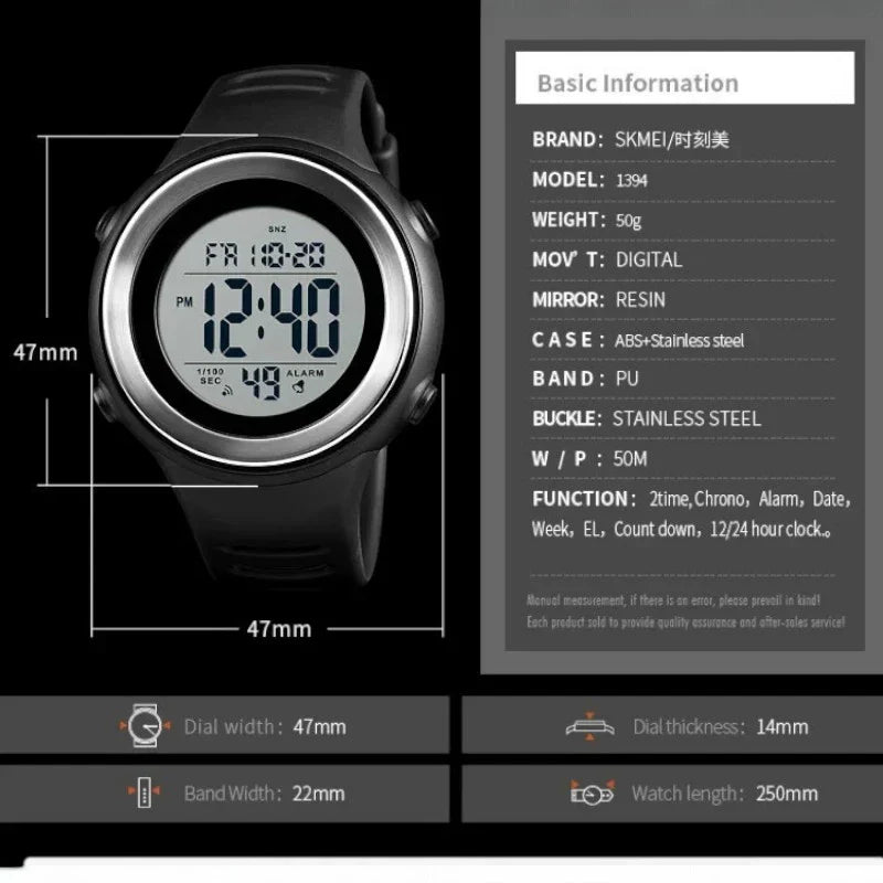 لا تفوت الفرصة! أضف ساعة SKMEI 1394 الرقمية الرياضية السوداء إلى سلة التسوق الخاصة بك الآن واستمتع بالثقة والأداء الذي تستحقه.