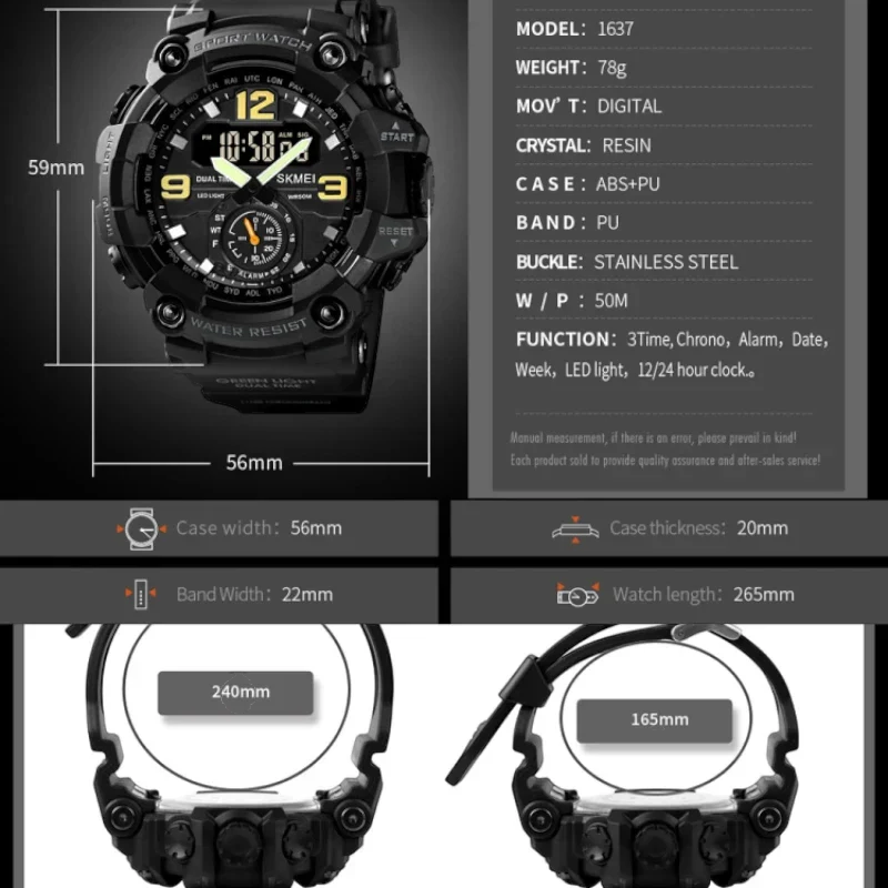 صُممت ساعة سكمي 1637 لتكون رفيقك في أصعب الظروف، حيث تجمع بين المتانة الفائقة والتكنولوجيا المتقدمة. تتميز بهيكلها الضخم بقطر 56 مم وتصميمها العسكري القوي بنمط التمويه الأخضر الجيشي، مما يمنحها حضورًا طاغيًا ومظهرًا تكتيكيًا لا مثيل له. الهيكل مصنوع من مزيج مرن من ABS و PU، وهو مصمم خصيصًا ليكون مقاومًا للصدمات.