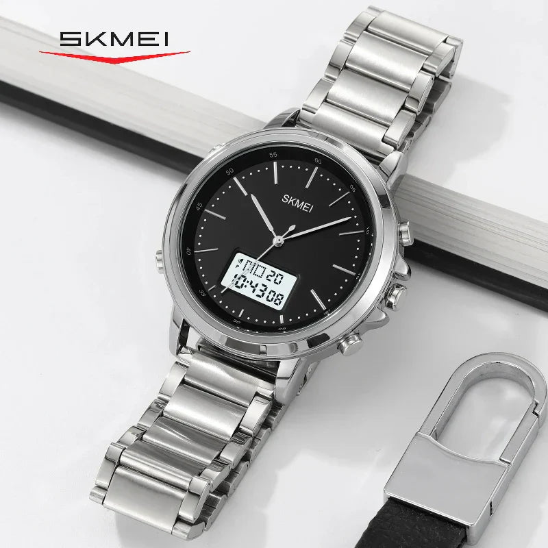 الميزة الأبرز هي شاشتها المزدوجة: عقارب أنالوج فضية أنيقة تشير للوقت بأسلوب تقليدي، وأسفلها شاشة رقمية كبيرة وواضحة (بخلفية فاتحة وأرقام داكنة) تعرض اسم اليوم والتاريخ والتوقيت الرقمي بدقة. مزودة بمجموعة من الوظائف العملية تشمل المنبه اليومي وساعة الإيقاف (ستوب ووتش) وإضاءة خلفية قوية لسهولة القراءة في الظلام. تعد ساعة سكمي 1652 خيارًا فاخرًا وعمليًا يناسب جميع مناسباتك.