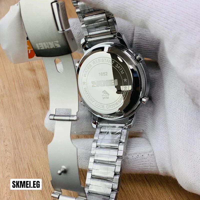 نقدم لكم ساعة سكمي 1652، التي تجمع ببراعة بين فخامة التصميم الكلاسيكي ووظائف العصر الرقمي. تتميز بهيكلها العصري بقطر 46 مم وسوارها المتكامل، كلاهما مصنوع من الفولاذ المقاوم للصدأ (استانلس ستيل) المصقول الذي يمنحها مظهرًا لامعًا وشعورًا بالجودة.