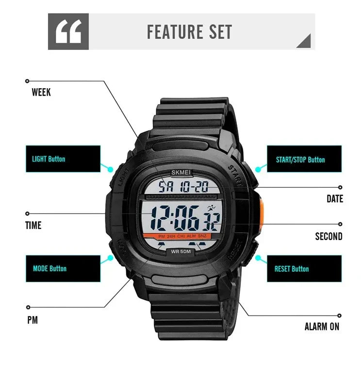 SKMEI 1657 ساعة رياضية رقمية مربعة متعددة الوظائف مع عداد للوقت مقاومة للماء