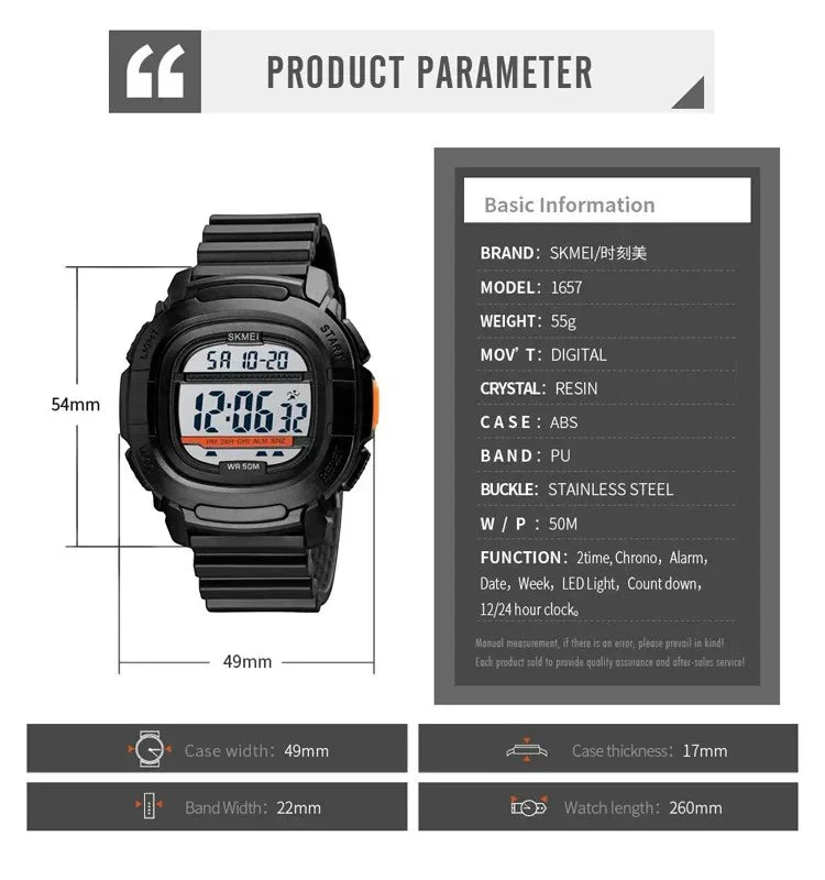 تتميز ساعة SKMEI 1657 بتصميم وجه مربع، ساعة رياضية رقمية مزودة بإمكانيات متعددة الوظائف. بفضل تقنية مقاومة الماء وميزات المنبه وساعة الإيقاف وشاشة تقويم LED، تعد هذه الساعة مثالية لأي نمط حياة نشط. حافظ على المسار الصحيح مع هذه الساعة الموثوقة والمتينة.