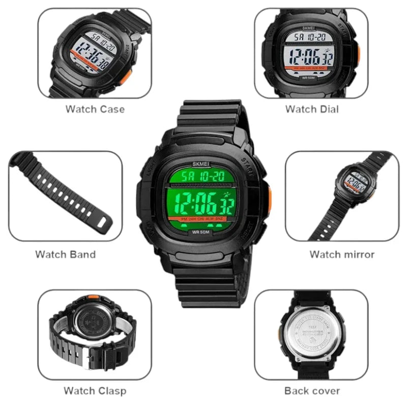 تتميز ساعة SKMEI 1657 بتصميم وجه مربع، ساعة رياضية رقمية مزودة بإمكانيات متعددة الوظائف. بفضل تقنية مقاومة الماء وميزات المنبه وساعة الإيقاف وشاشة تقويم LED، تعد هذه الساعة مثالية لأي نمط حياة نشط. حافظ على المسار الصحيح مع هذه الساعة الموثوقة والمتينة.