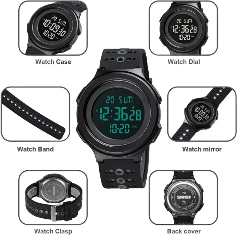 تحتوي ساعة اليد السوداء SKMEI 1733 على كل ما يحتاجه الرجل العصري - شاشة LED، وأجهزة إنذار متعددة الوظائف، وتصميم أنيق ومتين. مثالي للاستخدام اليومي!