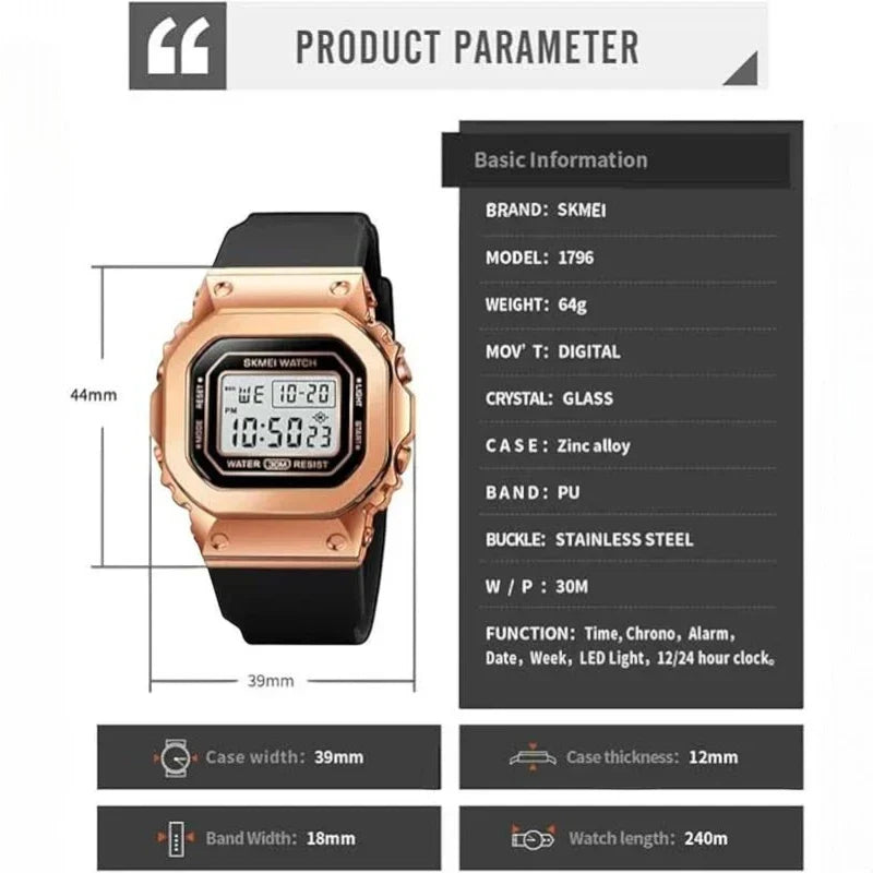 نقدم لكم ساعة سكمي 1796، وهي تحفة تمزج بين البساطة العصرية والأداء الرقمي الكامل. يتميز هذا الإصدار بهيكل مربع جذاب بلمسة فضية مصقولة، مما يخلق تباينًا حادًا مع السوار الأسود المريح المصنوع من البولي يوريثان. هذا المزيج اللوني الكلاسيكي متعدد الاستخدامات وأنيق، ومناسب تمامًا لكل من الرجال والنساء الباحثين عن إكسسوار عملي ومميز.
