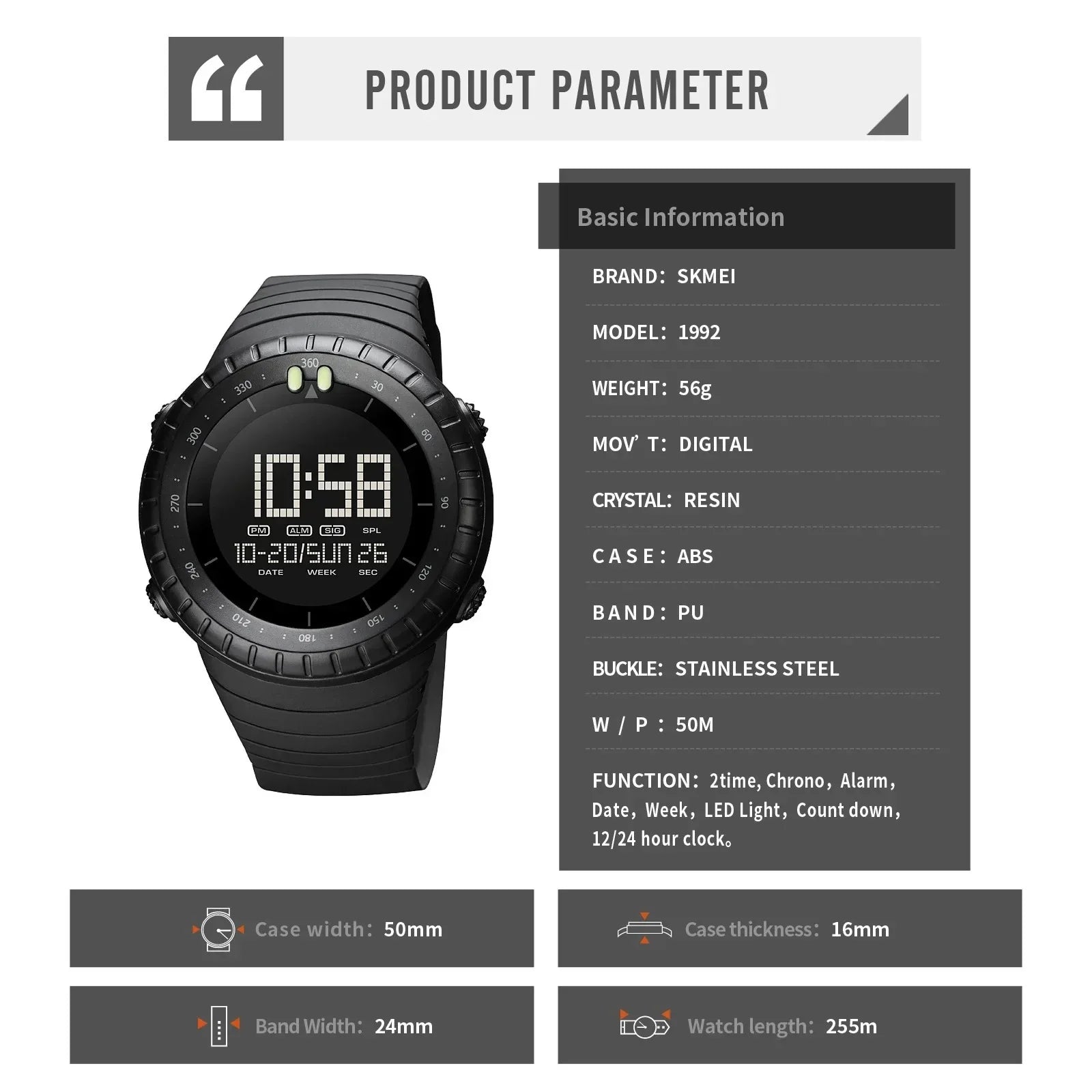 SKMEI 1992 ساعة رياضية متعددة الوظائف كاجوال انيقة للرجال مقاومة للمياه متعددة الوظائف، اسود