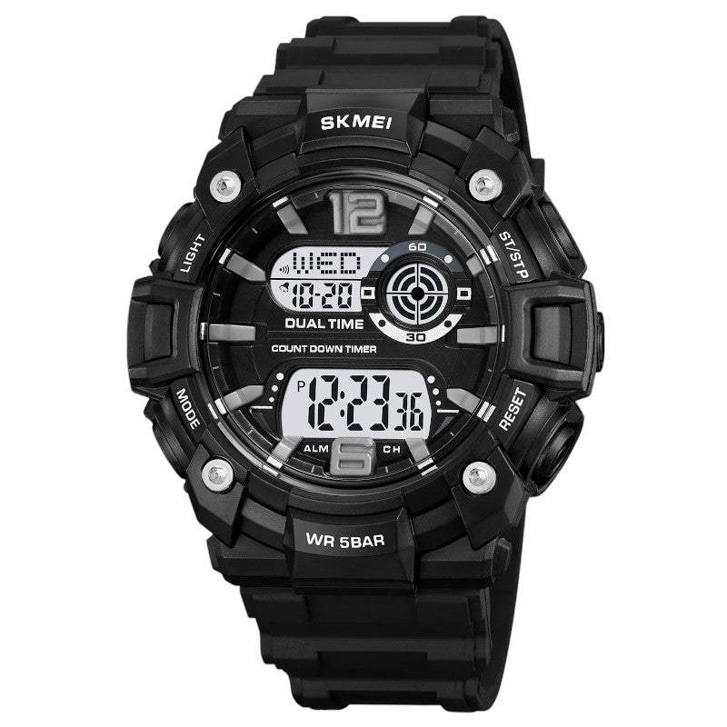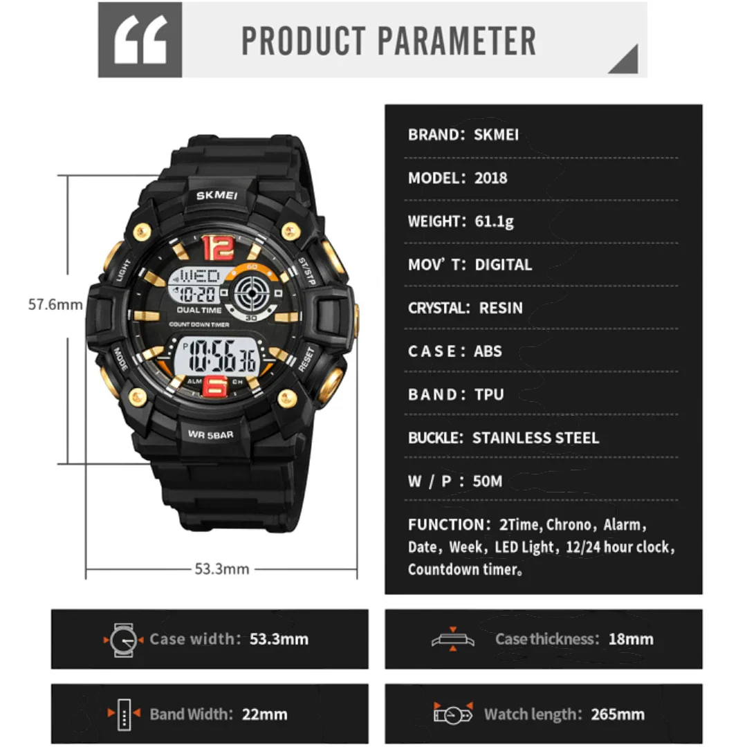 SKMEI 2018 ساعة رياضية رقميه مقاومة للماء متعددة الوظائف تقويم منبه ساعة ايقاف لون اسود بميناء فاتح