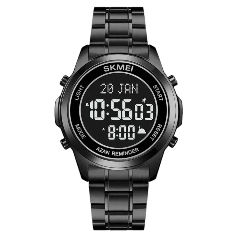 ساعة سكيمي 2097 أوقات الصلاة، تذكير الأذان، اتجاه القبلة، دعم اللغة العربية، التقويم الهجري، قرص داكن