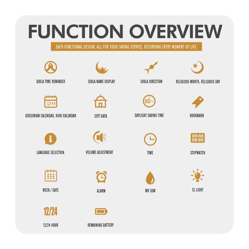 نقدم لك ساعة سكمي SKMEI موديل 2097، التحفة الأكثر تطوراً وفخامة في مجموعة الساعات الإسلامية. هذه الساعة تجمع بين التصميم الذهبي الأنيق الذي يخطف الأنظار، وأدق التقنيات التي تخدم المسلم في عباداته اليومية، مع جودة استثنائية تظهر في أدق تفاصيلها.