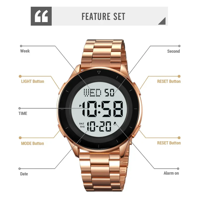 الوظائف الرقمية الأساسية: تتضمن كرونوغراف (ساعة توقيت)، ومنبه يومي، وعرض كامل للتاريخ والأسبوع لتبقيك على جدولك الزمني.