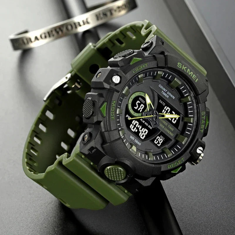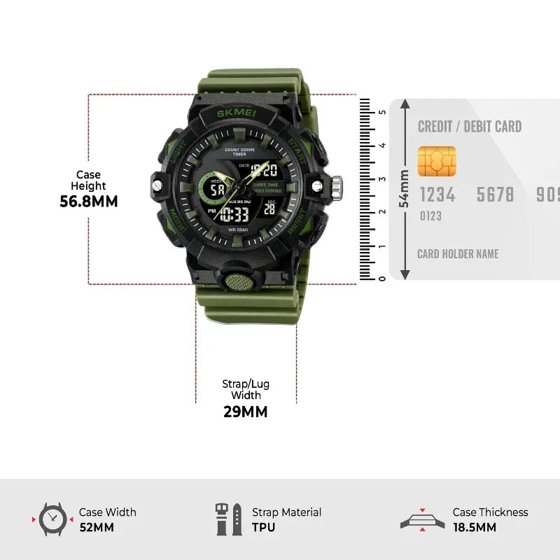 صُممت ساعة سكمي 1688 لتكون رفيقك الأمثل في كل الظروف، حيث تجمع بين المتانة الفائقة والتصميم التكتيكي الجريء. تتميز بهيكلها الضخم بقطر 51 مم باللون الأسود القوي، مع سوار متين باللون الأخضر الزيتي، مما يمنحها مظهرًا عسكريًا وعمليًا لا مثيل له. الهيكل مصنوع من مزيج مرن من ABS و PU، وهو مصمم خصيصًا ليكون مقاومًا للصدمات.