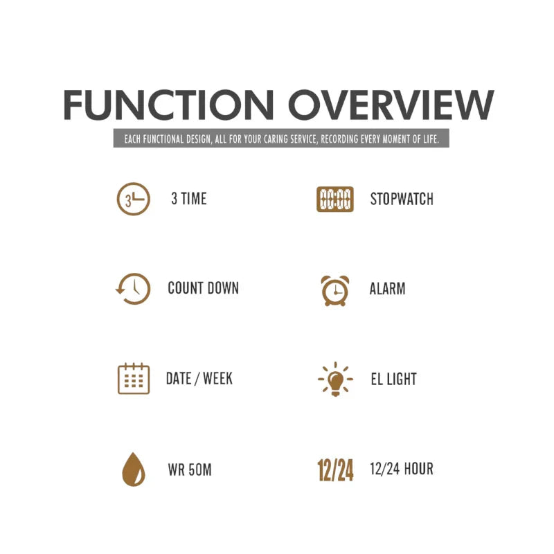 وظائف متكاملة: تشمل ساعة إيقاف (كرونوغراف)، منبهًا، وعرضًا كاملاً للتاريخ واليوم.