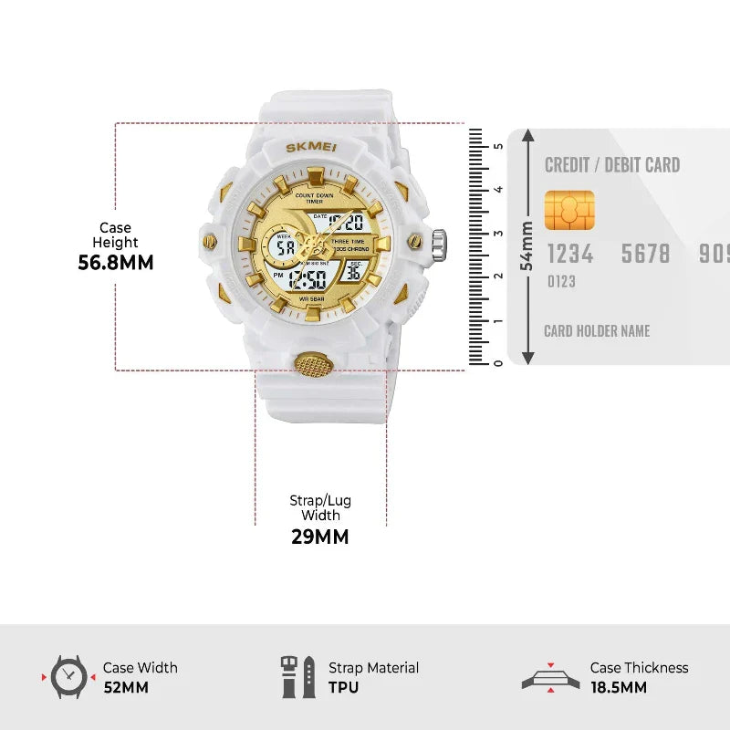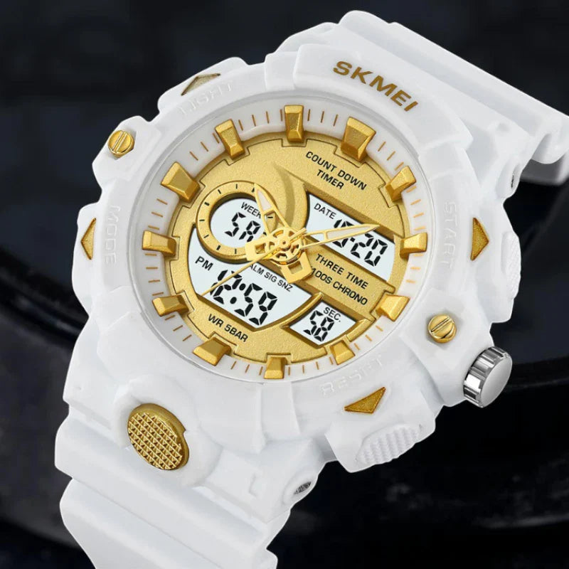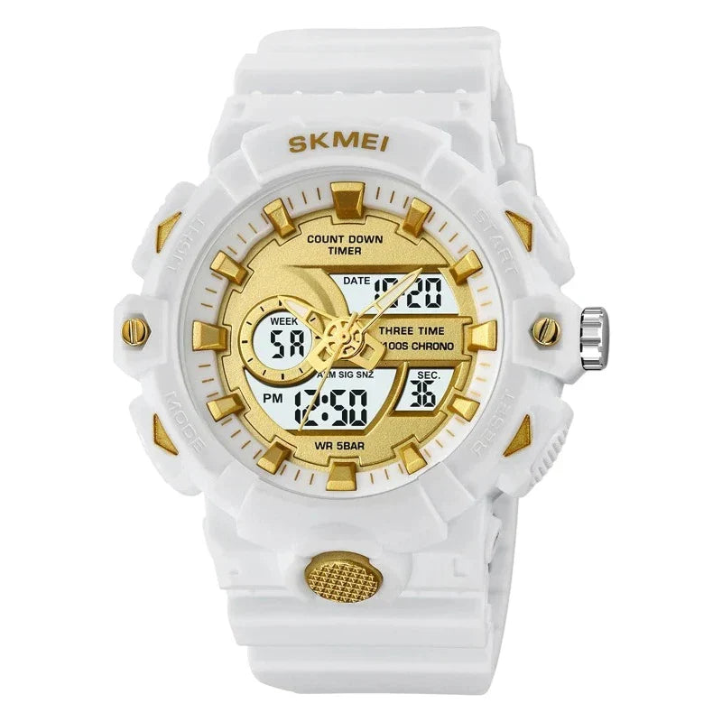 ساعة سكمي 2225 رياضية للجنسين مزدوجة رقمي وعقارب أبيض ذهبي