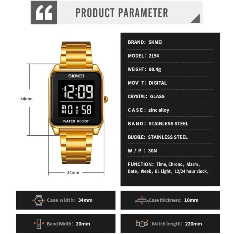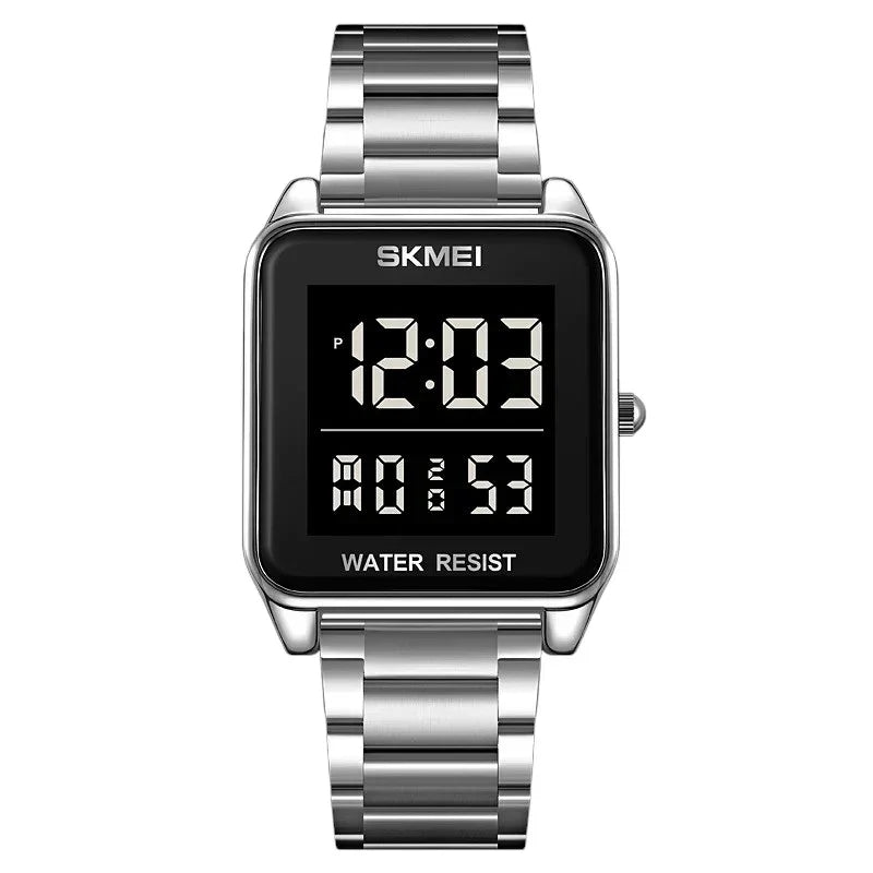 ساعة سكيمي ستانلس ستيل 2154 الرقمية للرجال هي المزيج المثالي بين الأناقة والعملية. مصنوعة من الفولاذ المقاوم للصدأ عالي الجودة، هذه الساعة متينة ومقاومة للصدأ. بفضل تصميمها المقاوم للماء، والوظائف المتعددة مثل التقويم الكامل، وعرض الوقت المزدوج، والمنبه اليومي، وتصميمها العصري الأنيق، فإن هذه الساعة مناسبة للارتداء اليومي والأنشطة الخارجية. قم بتحديث خزانة ملابسك بهذه الساعة الموثوقة والأنيقة.