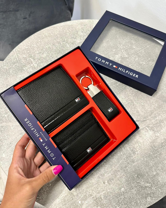 This Tommy Hilfiger set is a sophisticated and practical accessory designed for the modern man who values both style and functionality. It combines a sleek bi fold wallet, a handy card holder, and a key chain, all crafted from high-quality leather in a classic black color. The set exudes an air of luxury and promises lasting durability.