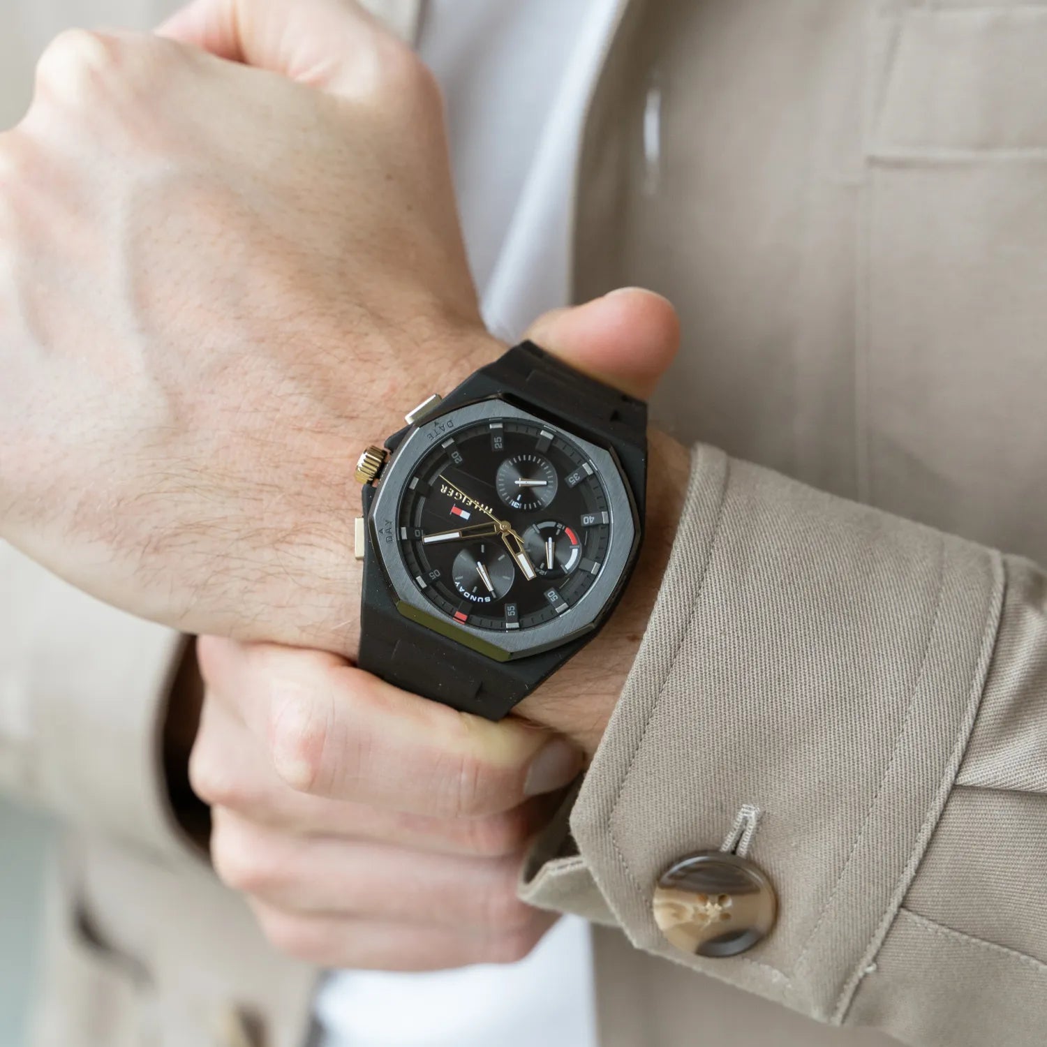 Discover timeless sophistication with the Tommy Hilfiger Men's Multi-Function Black & Gold Tone Watch. This striking timepiece is designed for the modern man who appreciates a bold statement combined with essential functionality.